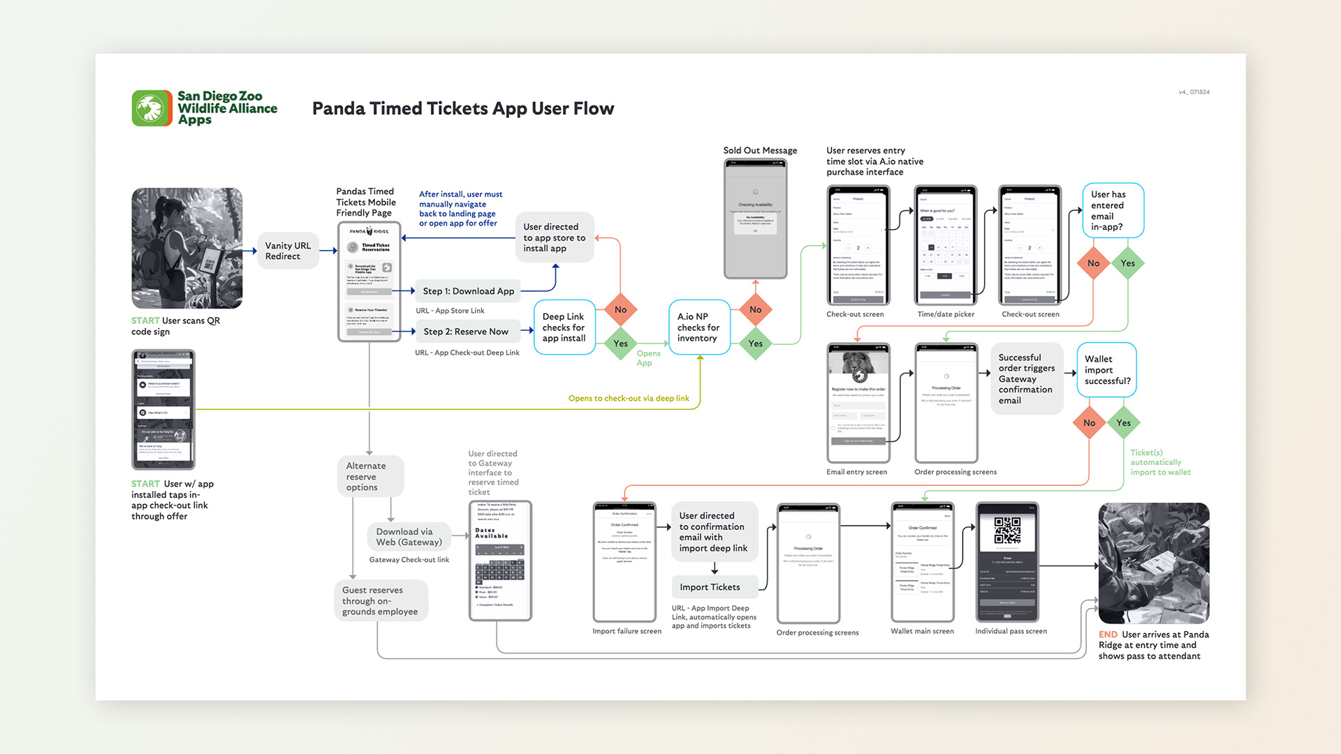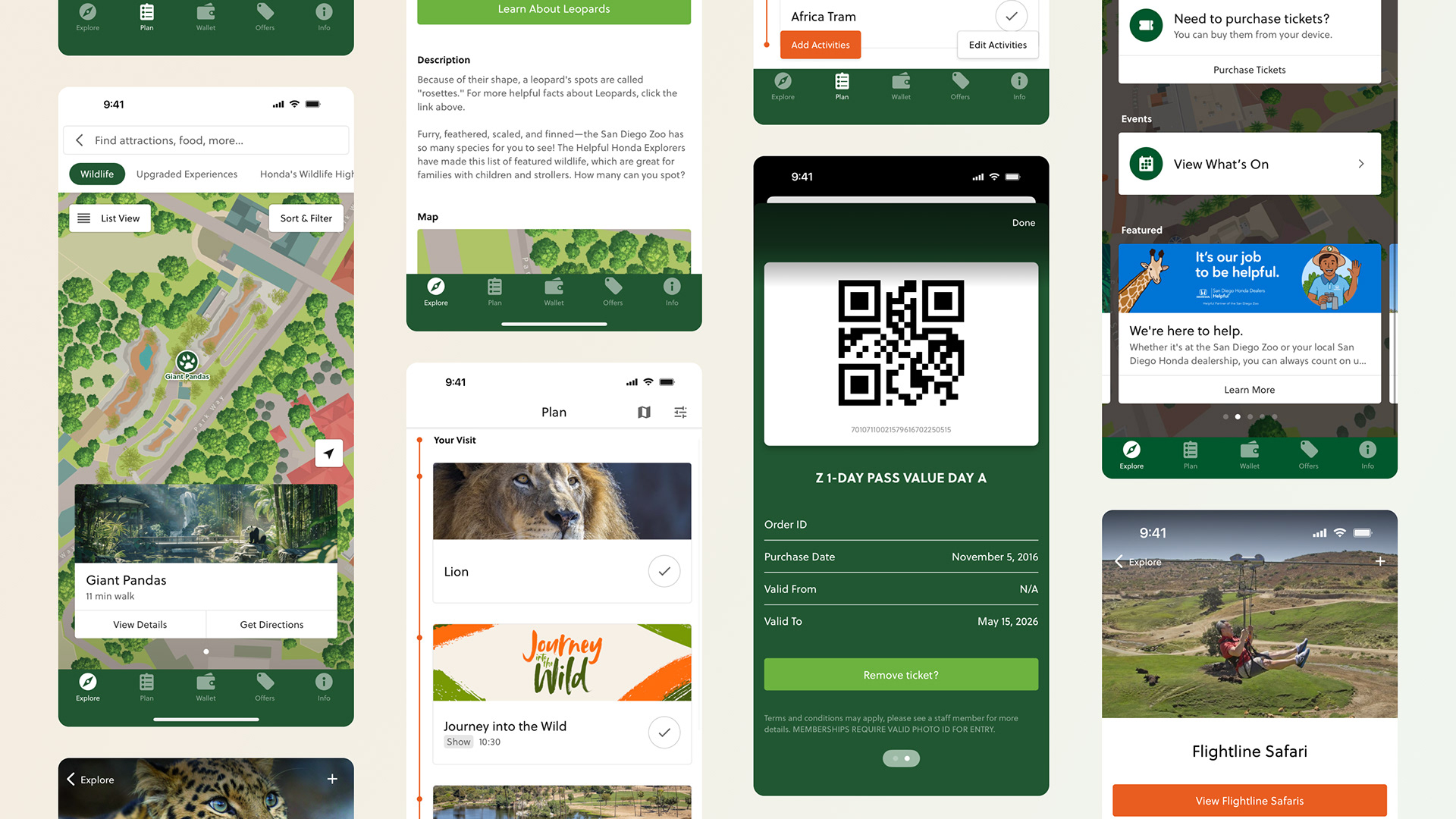 Joined the SDZWA mobile apps initiative at launch and helped scale it to millions of users. Took on UX leadership across design, visual strategy, and cross-functional coordination. Beyond guest-facing design, responsibilities included usability testing, integrating beacon technology, data analysis, producing training materials and documentation, and supporting facility operations teams. Led end-to-end user flows, system design, and development collaboration for ticketing, navigation, content, and branding — transforming the app into a critical guest experience touchpoint.